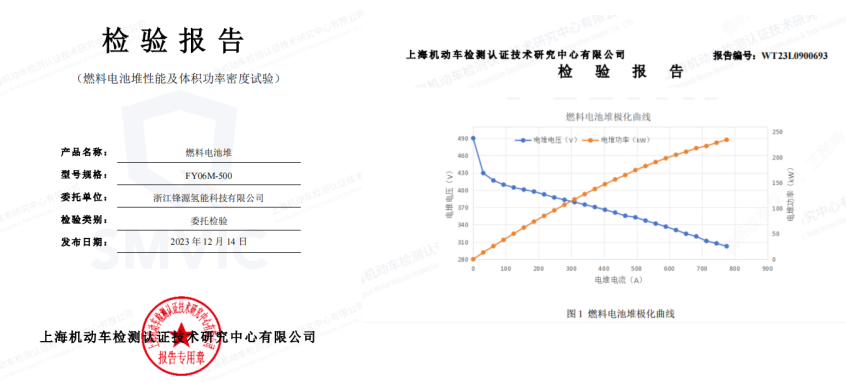近日,锋源氢能FY06M-500 电堆获得国家机构国标认证,进入量产并装车。此前,电堆性能经国家级检测中心上海机动车检测认证技术研究中心检验认证。